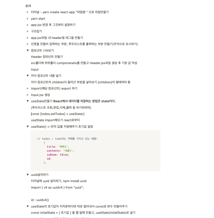 일단 Todo-list를 보지 않은 상태에서 마무리 할 수 있을 정도로 반복(내일까지)하고, 이후에 어떻게 살을 붙혀 나갈지, redux를 사용하면 어떤식으로 해야 할지에 대해 공부해 나가기로 했다.