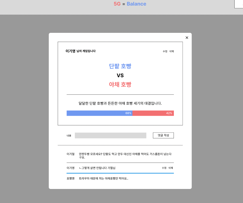 : 다음과 같이 한페이지에 밸런스 게임에 관한 contents와 댓글comments가 나눠지는데, 이 부분을 어떤 식으로 분배하여 진행해야할지 고민 -> 컴퍼넌트를 나누고, css 적인 부분은 추후 함께 진행
